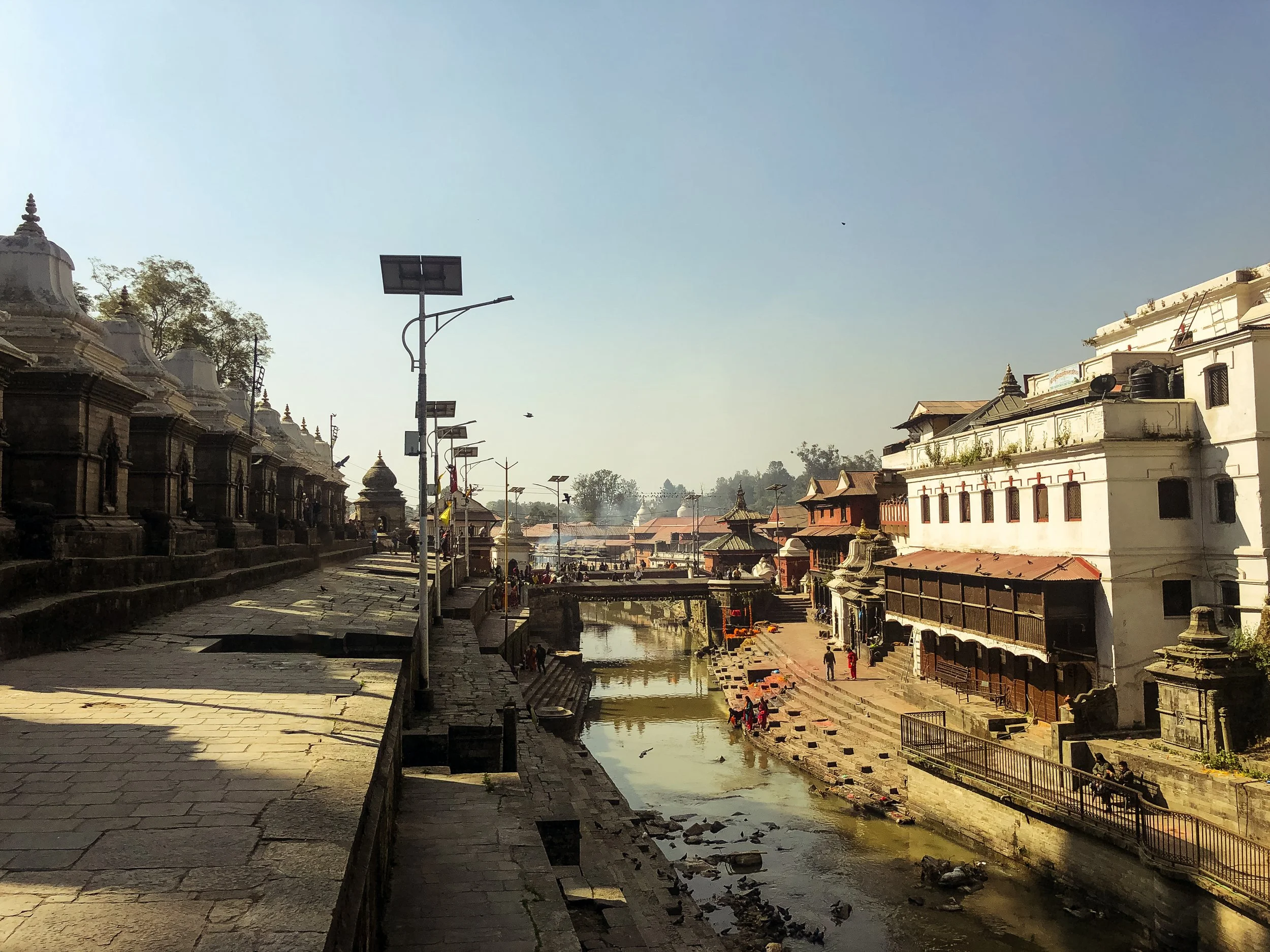 Pashupatinath Temple, Nepal's most sacred Hindu site dedicated to Shiva as Pashupati (Lord of Animals), where deceased bodies are cremated and their ashes immersed in the Bagmati River to ensure rebirth as a human in the next life, in a colorful ritual contrasting with western culture.